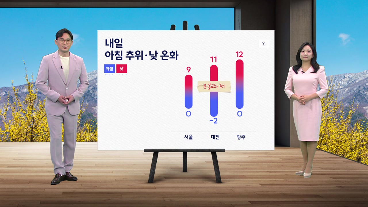 한낮에는 서울 9도, 대전 11도, 광주 12도까지 오르면서 일교차가 10도 안팎 크게 나겠습니다.