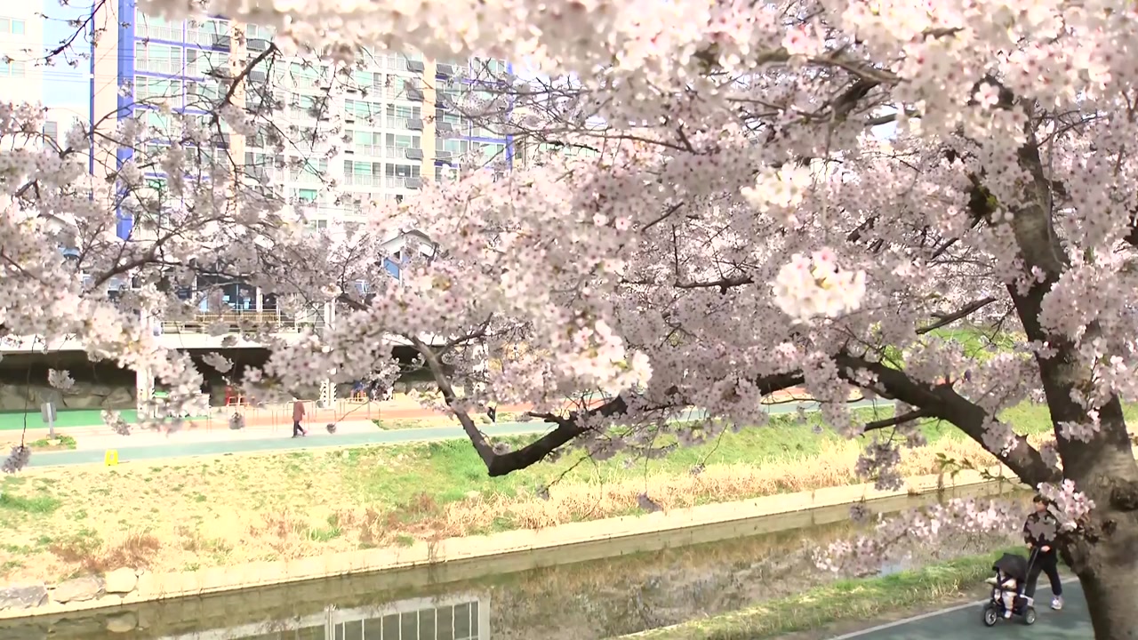 이곳도 강을 따라, 화사한 벚꽃이 만개하며 많은 시민의 눈길을 사로잡고 있습니다.