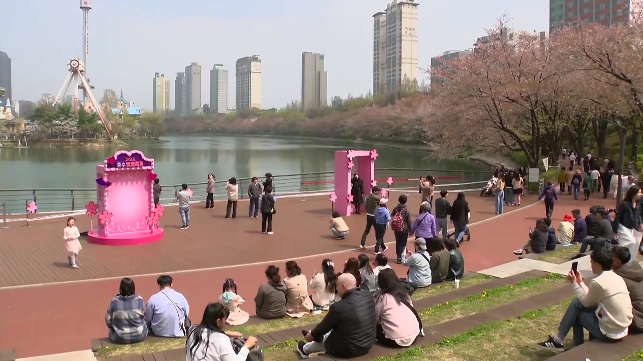 온화한 날씨 속 막바지 벚꽃 구경을 나온 시민들은 바람에 흩날리는 꽃잎 아래에서 아쉬운 듯 사진을 남기는 모습입니다.