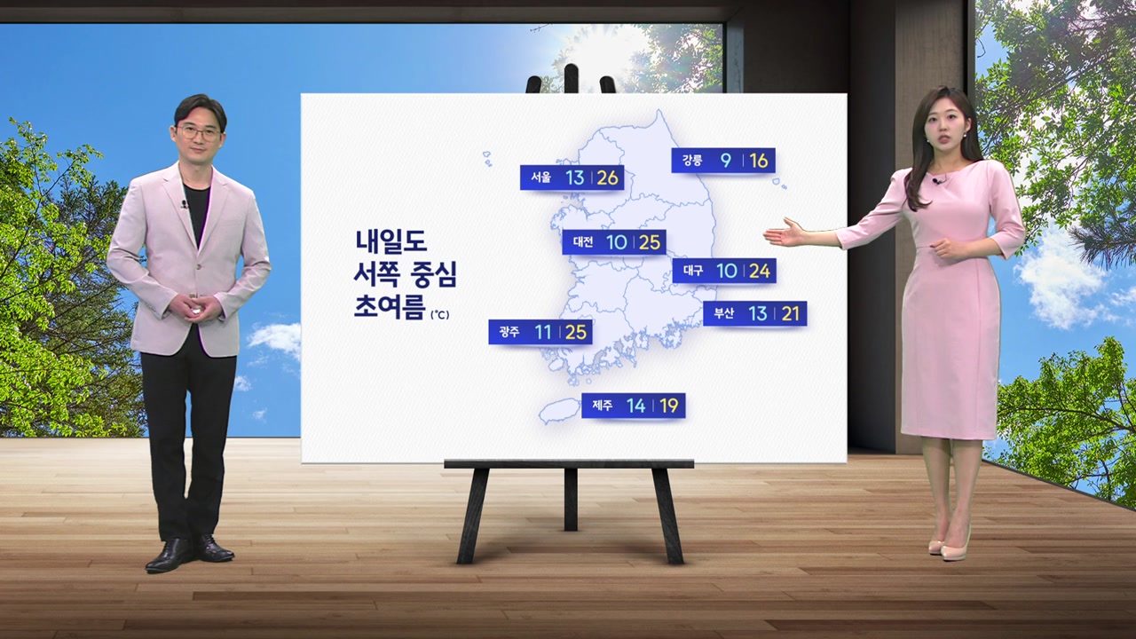 내일도 맑은 날씨 속에 서울 낮 기온이 26도, 대전과 광주 25도까지 오르는 등 서쪽 지역에서초여름 날씨가 이어지겠습니다.