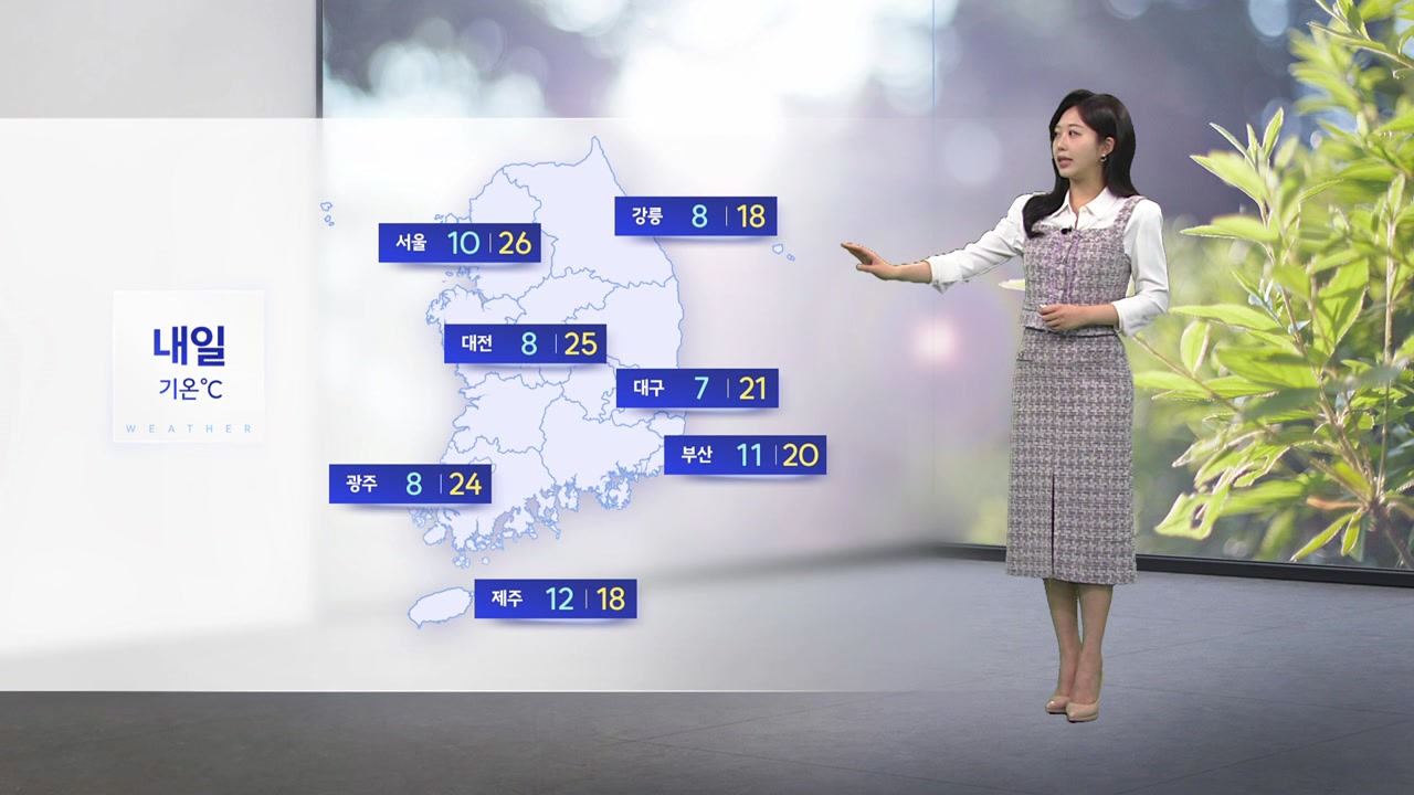 한낮에 서울 26도, 대전 25도, 광주 24도 등 서쪽 지역은 다소 덥겠습니다.