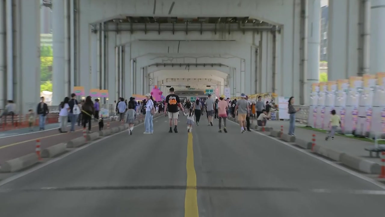 잠수교의 차량 통행을 막고 보행자에게 전면 개방하는 건데요, 시민들은 다리 위를 산책하거나 그늘에 마련된 텐트에서 휴식을 취하기도 하고요.