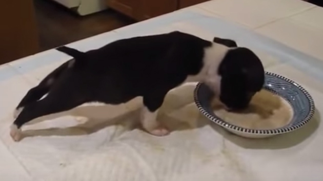 허겁지겁 밥을 먹고 있는 강아지. 그런데 뒷다리가 자꾸만 땅에서 멀어집니다.