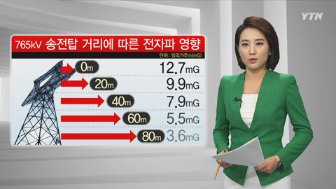 한국전력 측은 그러나 밀양에 설치될 송전탑에선 이보다 낮은 전자파가 발생하므로 아무런 문제가 없다는 입장인데요, 밀양지역에 건설 예정인 765kV 송전선로 80m 이내에는 단 1가구 밖에 없고, 전자계 노출로 암이 진전된다고 확증할 수 없다는 결론을 내렸다고 반박하고 있습니다.