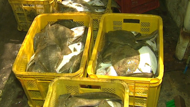 물속에 하얀 배를 드러내고 죽어있는 넙치를 꺼내고 있지만, 꺼내도 꺼내도 끝이 없습니다.