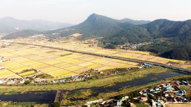 황금 물결 넘실대는 들녘 너머로 정남진 전남 장흥을 상징하는 산이 우뚝 솟아 있습니다.