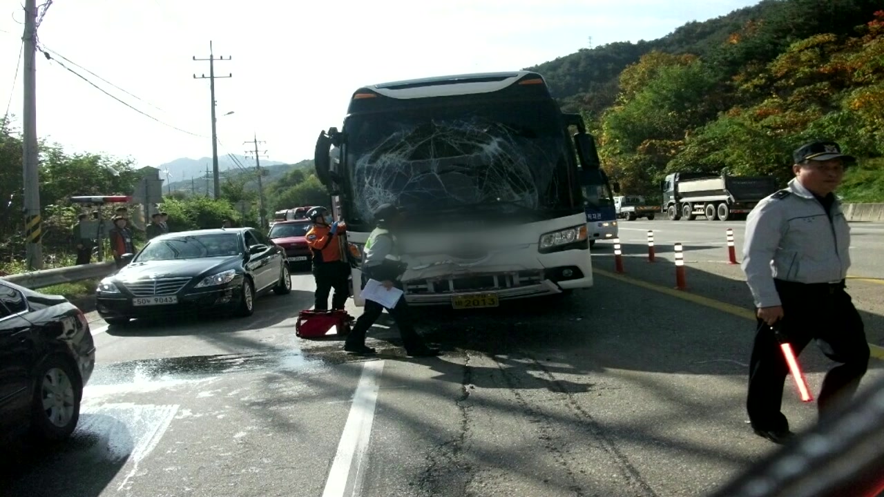 오늘 오전 10시 10분쯤 강원도 인제군 인제읍 덕산리 44번 국도에서 관광버스가 앞서가던 관광버스를 들이받았습니다.