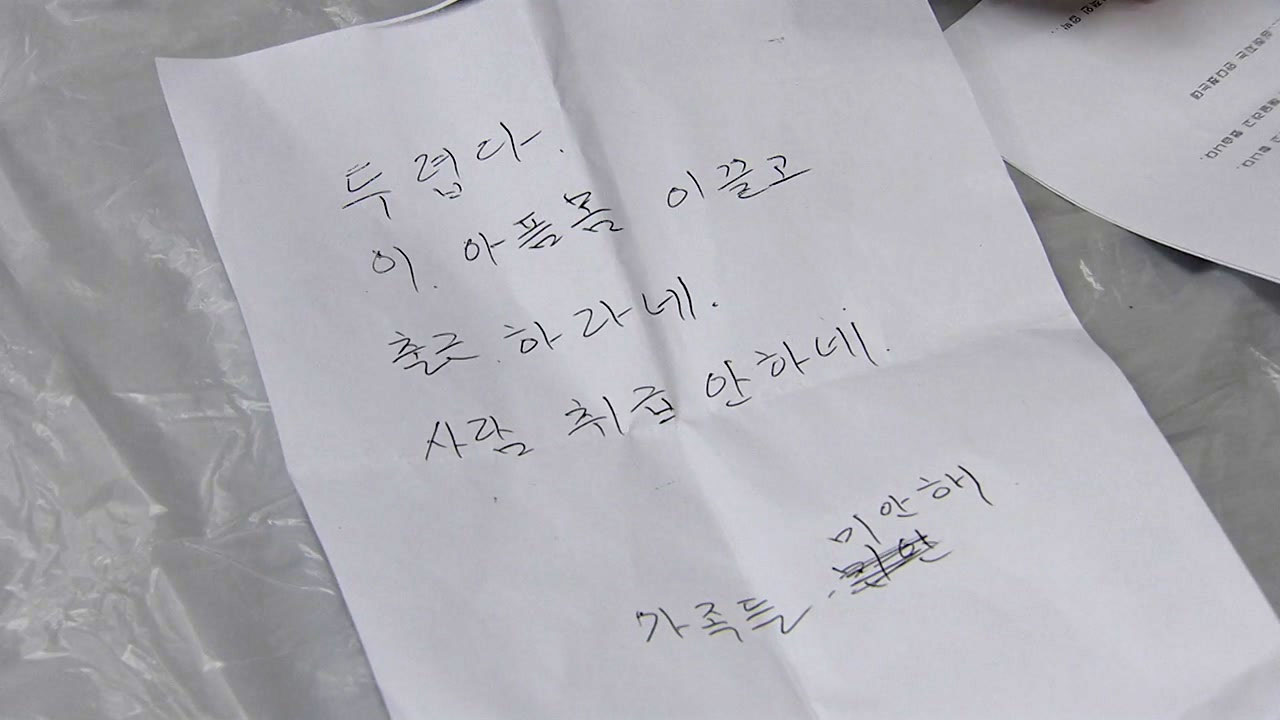 이 씨가 숨진 방에서는 번개탄을 피운 흔적과 함께 A4 한 장에 쓰인 유서가 나왔습니다.