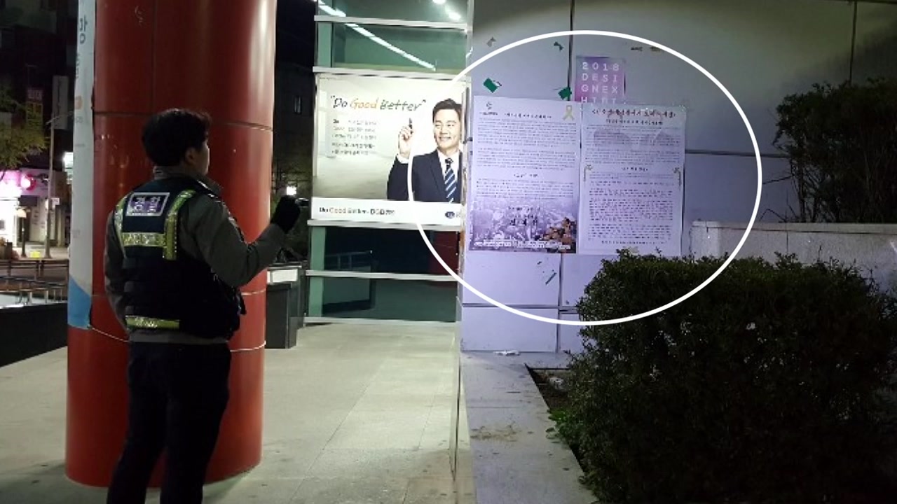 [경남 지역 대학 관계자 : 학생 등교를 하는 시간에…. 게시대 정해진 기준이 아닌 게시대 밖에 게시돼 있었습니다. 게시물은 기준에 따라 철거된 것으로….]