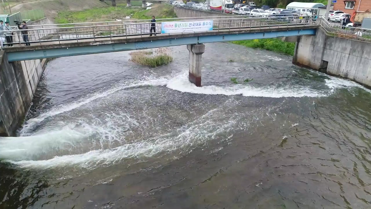 해마다 이맘때쯤 풍년 농사를 기원하는 '통수식' 이 열리는데요, 저수지에서 물을 흘려보내는 현장을 김범환 기자가 다녀왔습니다.