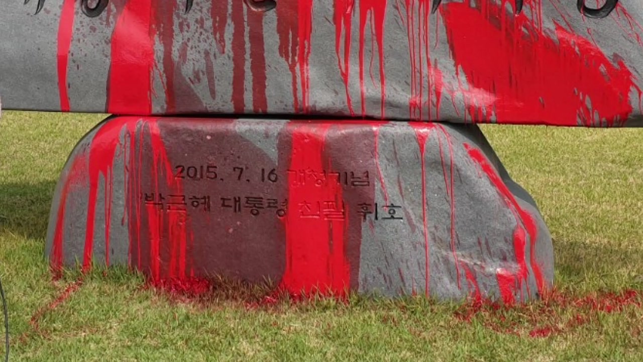 어제 오전 10시쯤 자신을 20대 세종시민이라고 밝힌 남성이 박근혜 전 대통령이 쓴 글씨로 새긴 세종시청 표지석에 붉은 페인트를 뿌렸습니다.