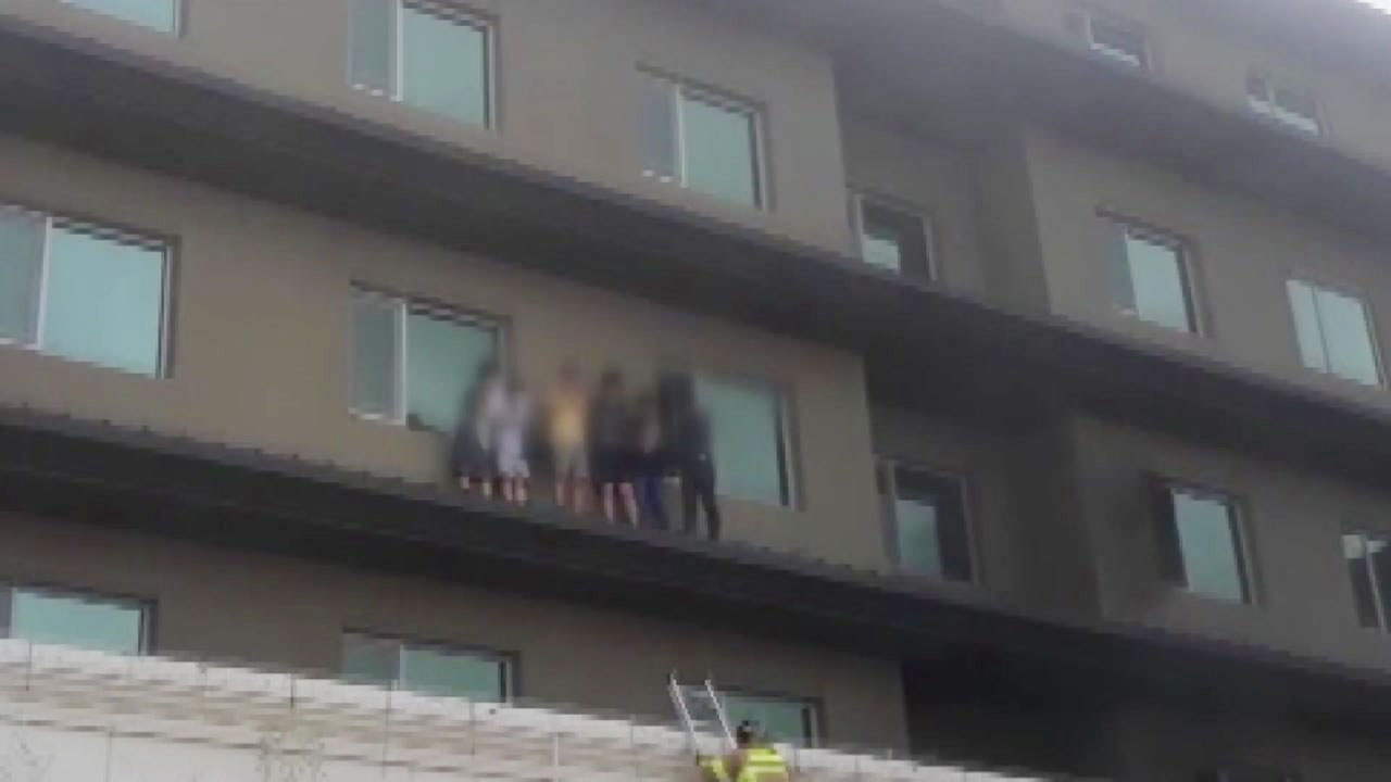 창문 밖 난간에 투숙객이 아슬아슬하게 서서 구조를 기다립니다.