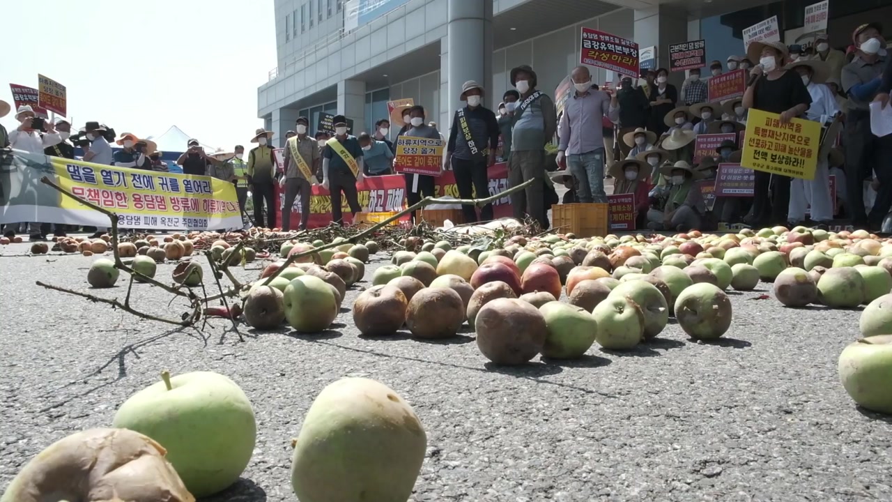 주민들은 폭우로 침수돼 썩은 인삼·사과 등 지역 특산품을 금강유역본부 현관 앞에 뿌리며 항의했습니다.