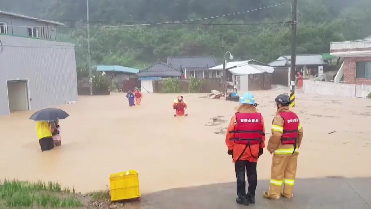 천북면 신당리 하천과 경주 남천이 범람하면서 주민들이 마을회관으로 대피했습니다.