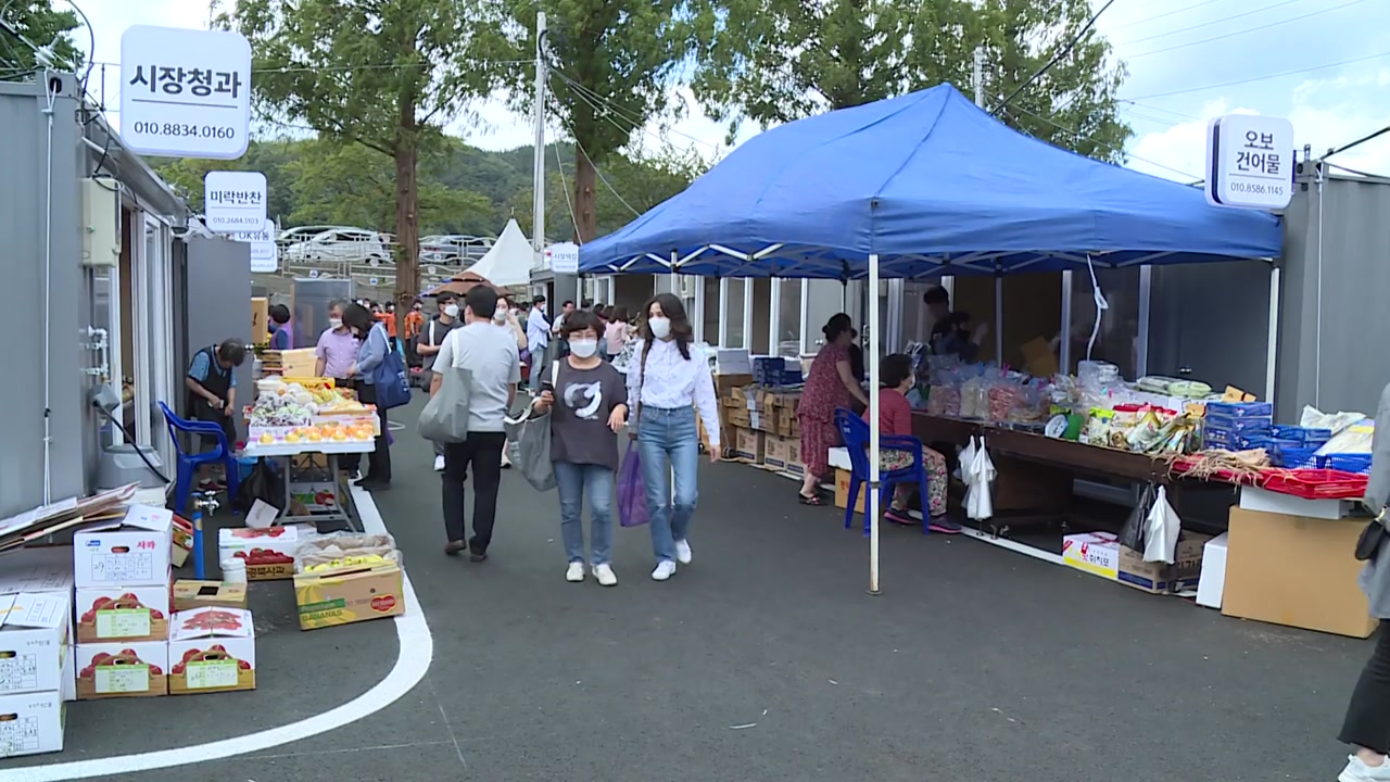 임시 시장은 컨테이너 점포 46개와 화장실 등 4천 제곱미터 규모로 마련됐고, 영덕시장 재건축이 완료될 때까지 운영합니다.