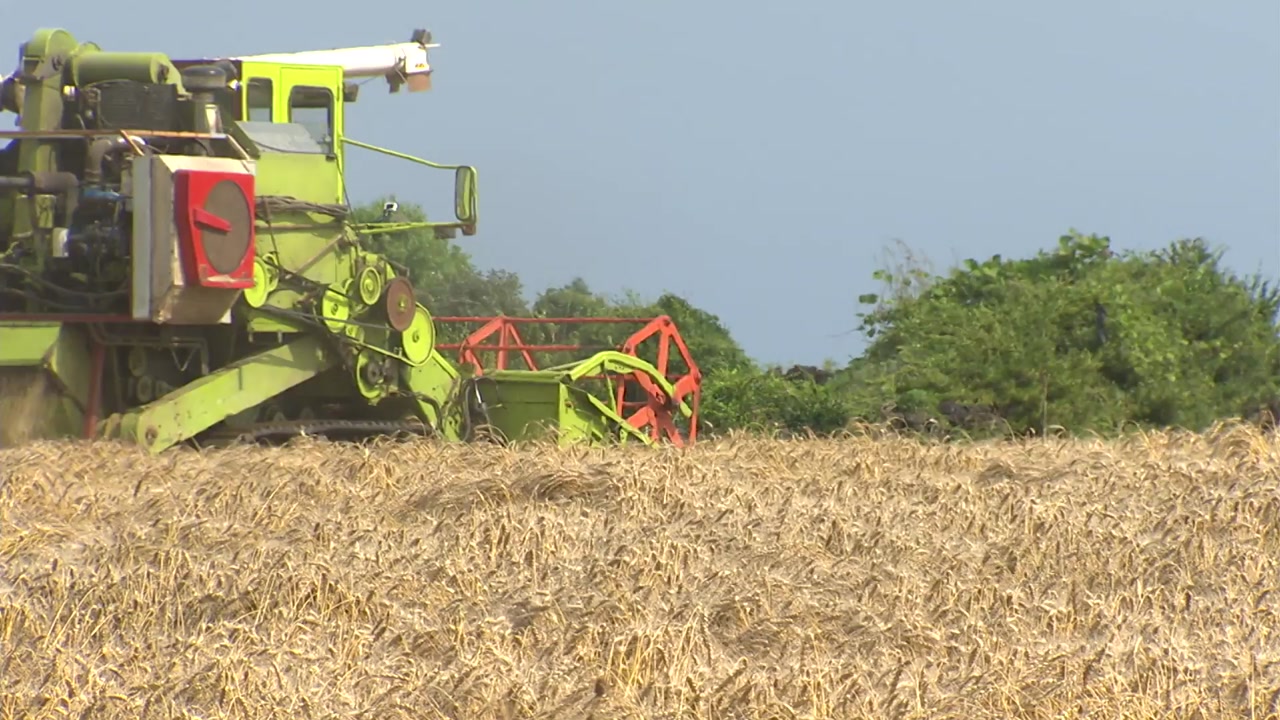 국산 밀이 잘 자란 넓은 밭에서 추수가 한창입니다.