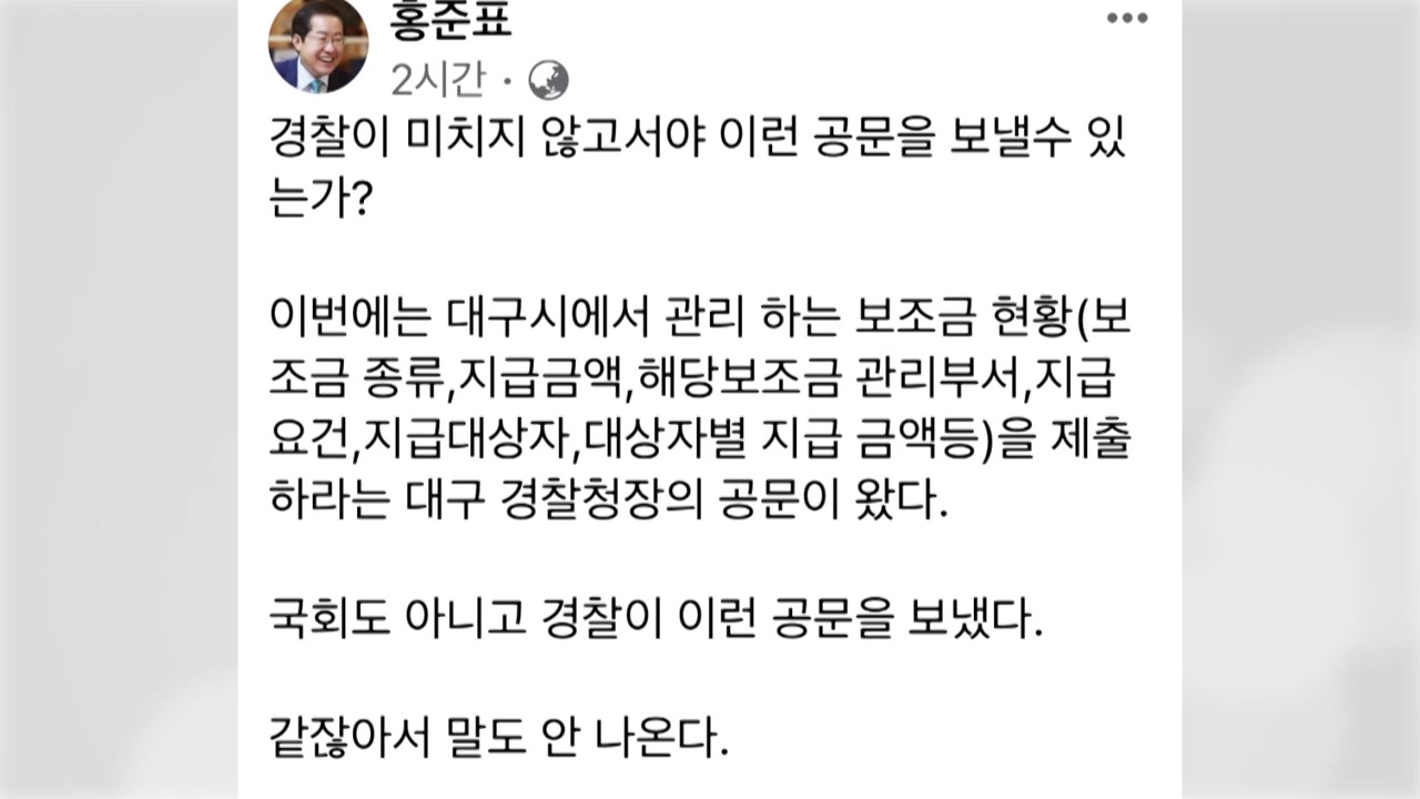 홍 시장은 "이번에는 시에서 관리하는 보조금 현황을 제출하라는 대구경찰청장의 공문이 왔다"며 "국회도 아니고 경찰이 이런 공문을 보냈다"면서 "같잖아서 말이 안 나온다"고 했습니다.