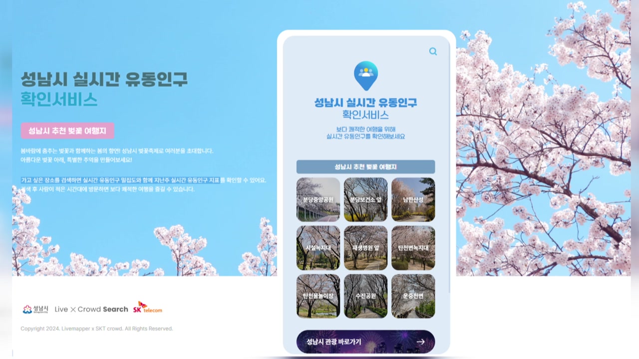 서비스에선 지난주 유동 인구 지표정보와 전날 같은 시간대 인구수를 비교할 수 있고, 봄꽃 개화 시기에 맞춰 '성남 벚꽃 9경'을 주제로 한 9개 장소의 기본 정보도 제공합니다.