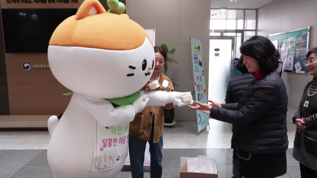 농촌진흥청이 3월 14일 '백설기데이'를 앞두고 국립식량과학원 본관 1층 로비에서 백설기 나눔 행사를 열었습니다.