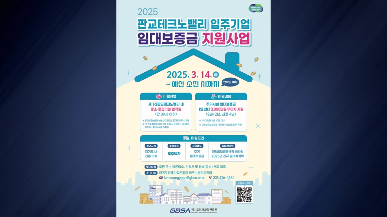 경기도와 경기도경제과학진흥원은 판교테크노밸리에서 근무하는 청년 임직원들의 주거 안정을 위해 한 명당 최대 3,000만 원을 지원하는 임대보증금 지원사업을 추진한다고 밝혔습니다.