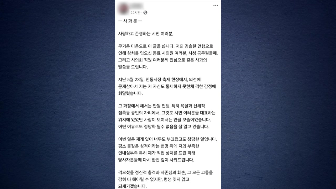 A 씨는 SNS에 올린 사과문에서, 의전을 문제 삼아 자신도 통제하지 못한 채 격한 감정에 휘말렸다며, 피해자에게 깊이 사죄한다고 밝혔습니다.