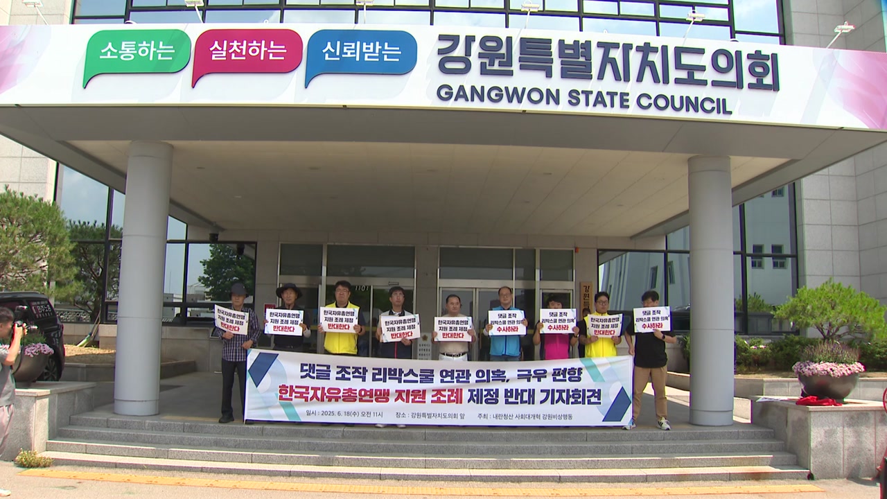 이들은 오늘(18일) 오전 강원도의회 앞에서 기자회견을 열고 "여론 조작 댓글 의혹을 받는 '리박스쿨'과 한국자유총연맹의 연관성이 의심되는 상황"이라며 "정치 편향적 활동을 하는 단체에 조례까지 만들어 보조금을 지원하는 건 공공성에 어긋난다"고 주장했습니다.