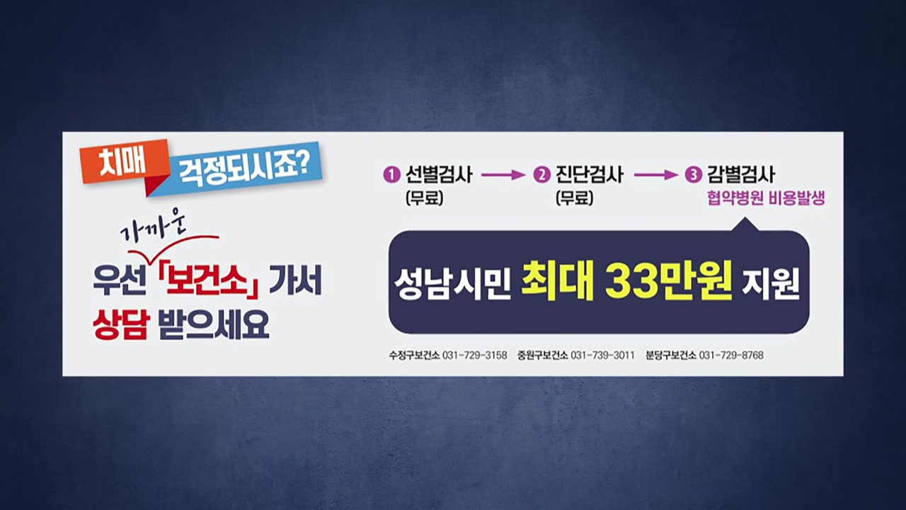 성남시는 다음 달 1일부터 치매 감별검사 본인부담금 최대 33만 원 지원 사업 대상을 모든 시민으로 확대한다고 밝혔습니다.