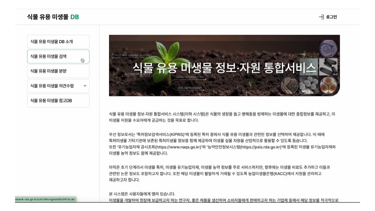 농촌진흥청이 미생물 정보 검색과 분양 신청을 한 번에 할 수 있는 '식물 유용 미생물 정보·자원 통합서비스' 시스템을 구축했습니다.