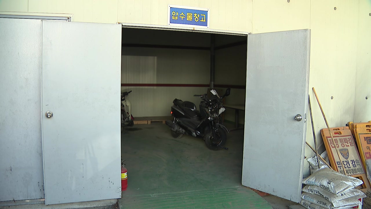 그런데도 경찰은 잠금장치를 설치하지 않은 채 압수물 창고 앞에 보관한 것으로 파악되었습니다.