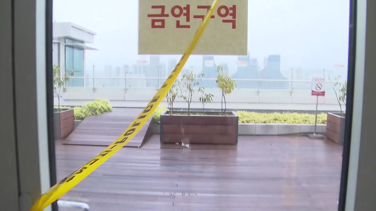 유리 난간이 떨어져 나가 있고, 현장 주변에는 출입을 막는 통제선이 내걸렸습니다.
