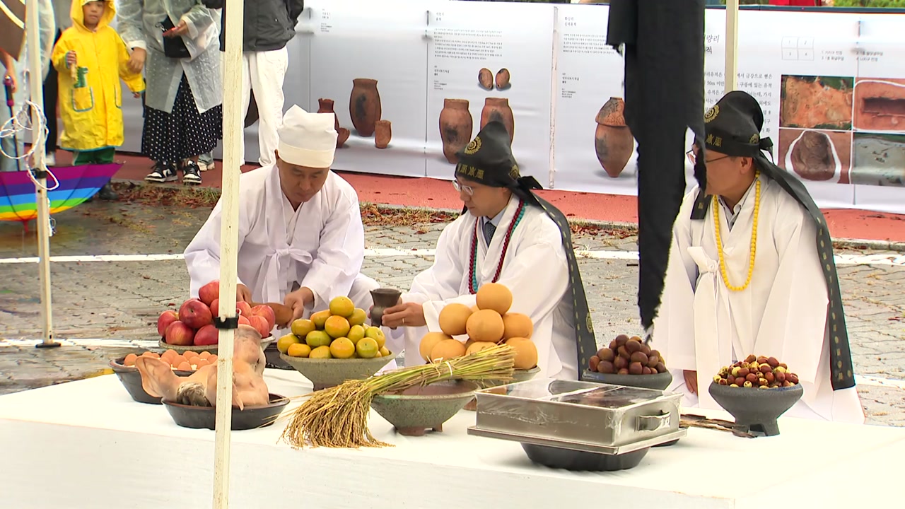 비가 내리는 가운데 전북 익산 영등시민공원 한가운데에 제사상이 차려졌습니다.