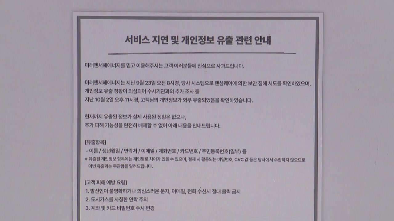 미래엔서해에너지는 지난달 23일 랜섬웨어로 인한 보안 침해 시도를 확인해 수사기관과 조사하는 과정에서 지난 2일 고객 개인정보가 외부로 유출된 사실을 확인했다고 밝혔습니다.