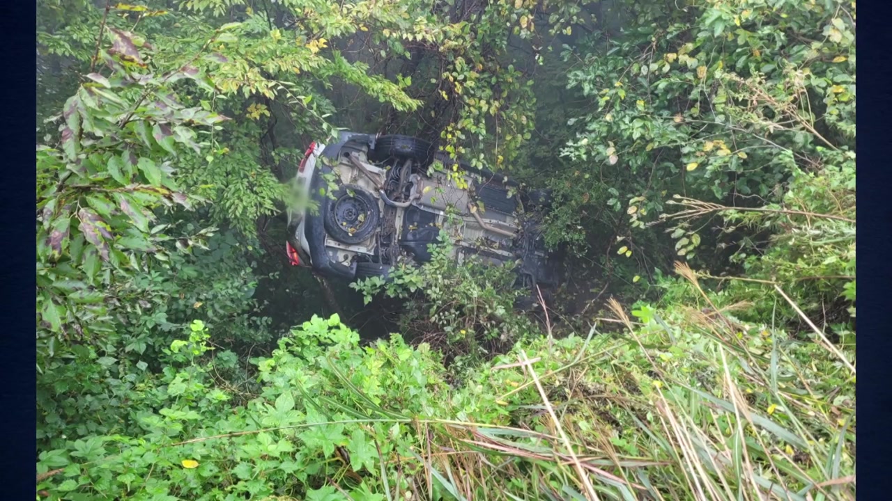어제(7일) 낮 1시 반쯤 전남 구례군 시암재 휴게소에서 SUV 차량이 주차장 울타리를 들이받고 산비탈로 추락했습니다.