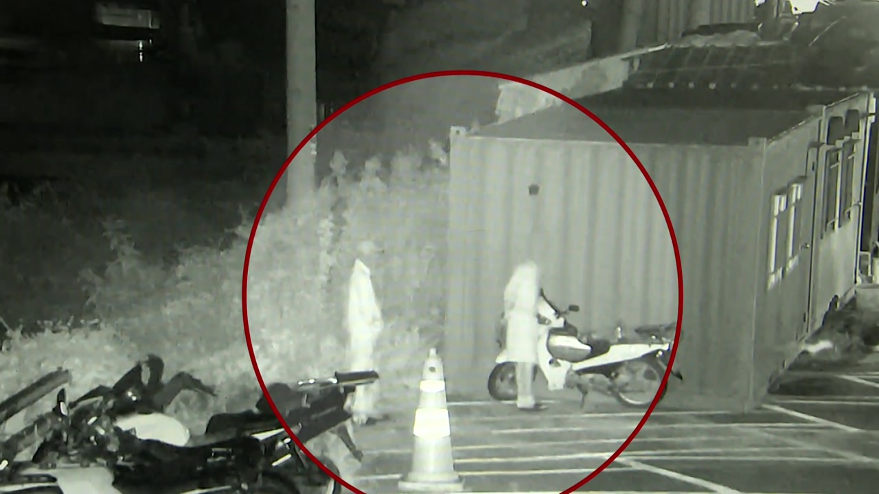 복면으로 얼굴을 가린 남성 두 명이 주차된 오토바이 주변을 서성입니다.