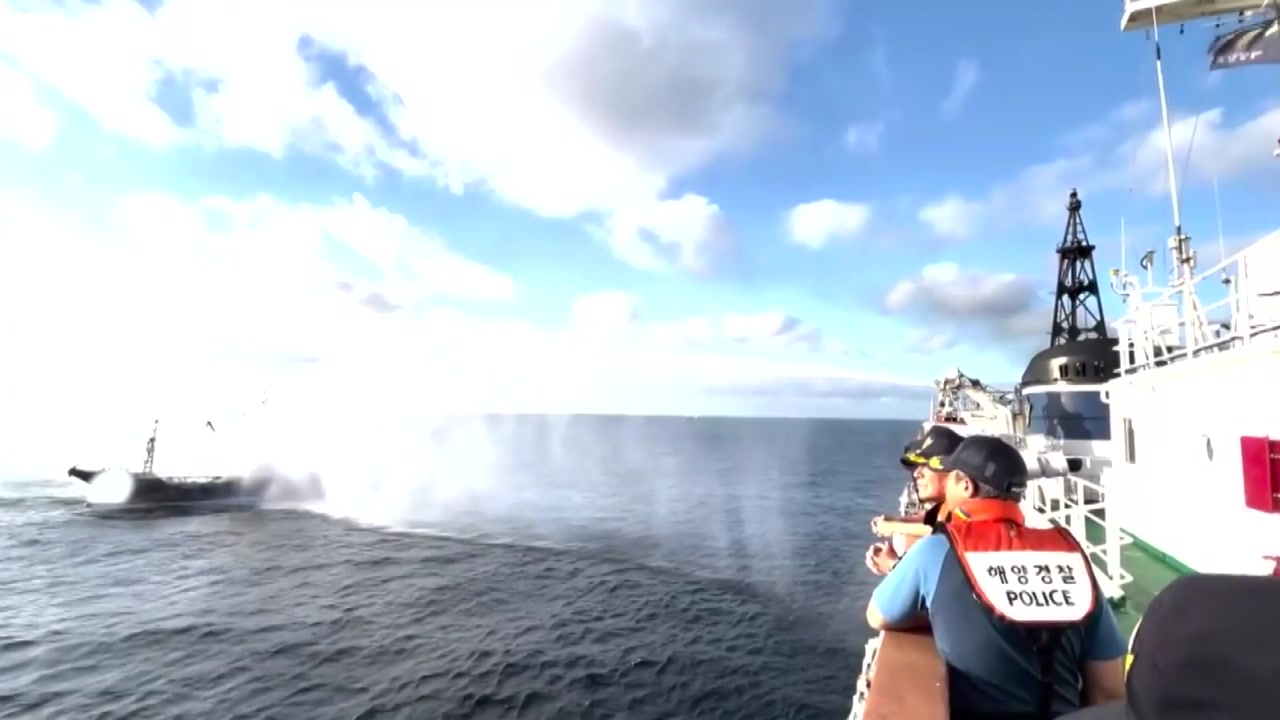 불길에 휩싸인 어선을 향해 해경 경비함이 물대포를 뿌립니다.