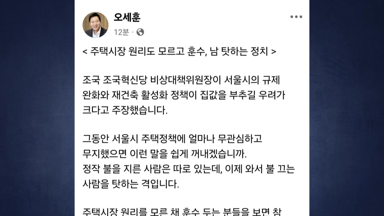 오세훈 서울시장은 조국 조국혁신당 비상대책위원장이 서울시 규제 완화와 재건축 활성화 정책이 집값을 부추길 우려가 크다는 주장한 데 대해 "불을 지른 사람은 따로 있는데 이제 와서 불 끄는 사람을 탓하고 있다"고 비판했습니다.