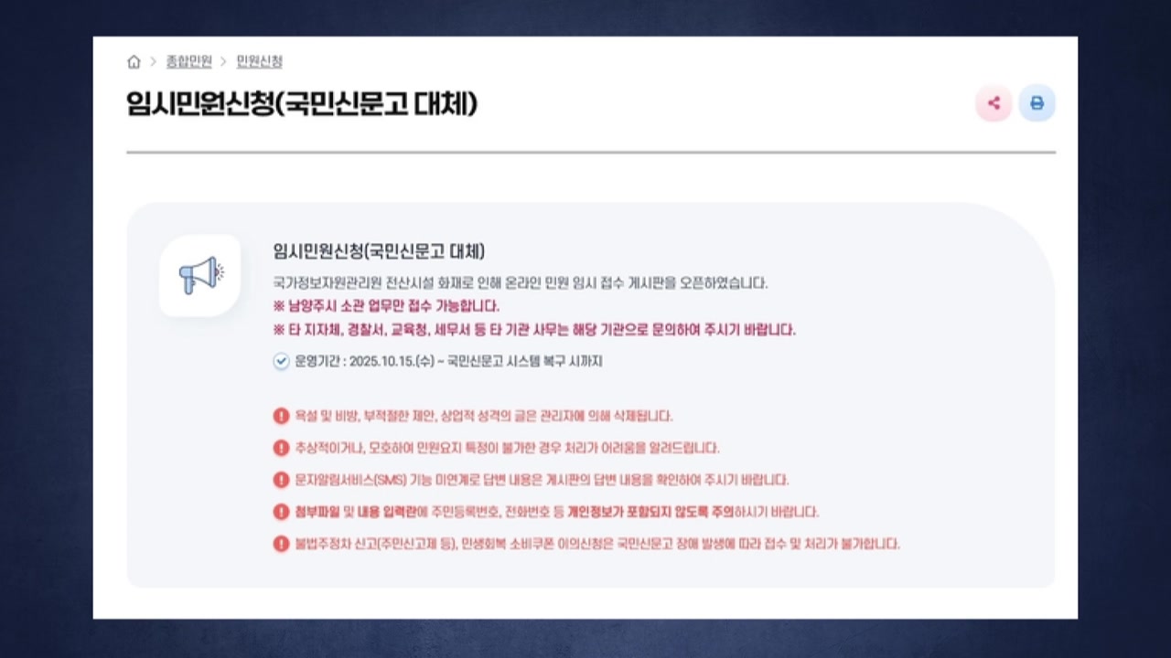 남양주시는 국가정보자원관리원 화재로 국민신문고 서비스가 중단됨에 따라 시 누리집에 '임시 민원신청 게시판'을 개설해 운영에 들어갔습니다.