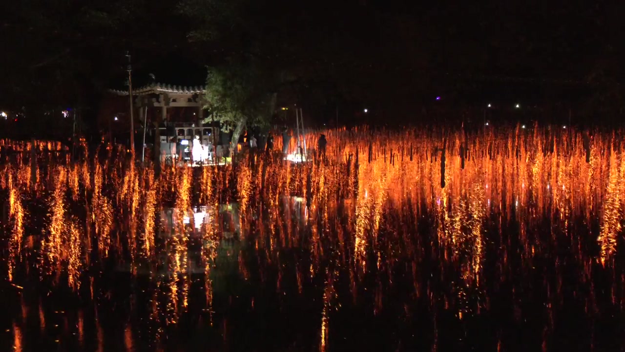 가을이 깊어져 가는 10월, 어둑해진 함안 무진정 앞 연못에 '불꽃비'가 내립니다.