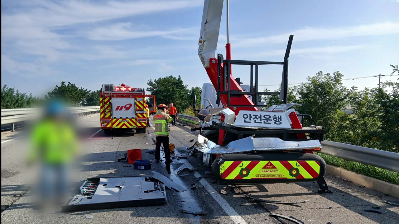 어제(22일) 오전 9시쯤 전북 부안군 서해안 고속도로 상행선 서김제 나들목 인근에서 24톤 화물차가 고속도로 공사 작업 차량을 들이받았습니다.