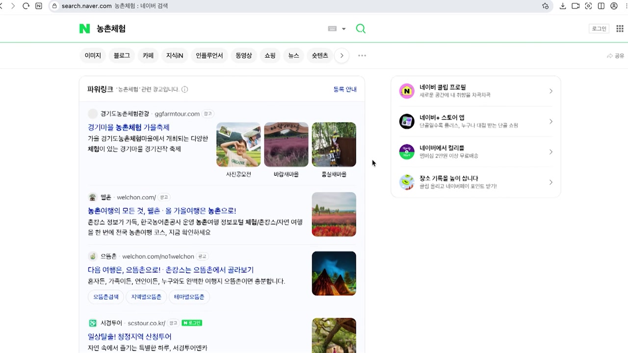 네이버 검색창에 '농촌체험'을 입력하면 통합검색 '프로그램' 정보창에서 전국 농촌체험 프로그램을 쉽게 볼 수 있으며 만족도와 이용 추이를 조사해 향후 서비스 범위를 확대할 계획입니다.