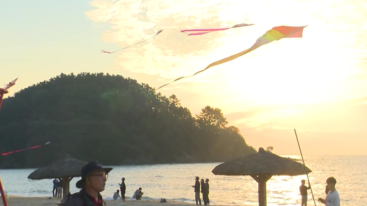 가을 바다 위로 붉게 타오르는 노을을 주제로 한 축제가 열리고 있습니다.