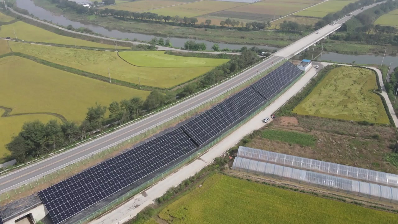도로와 마을 사이 경사로에 태양광 패널이 빼곡하게 들어섰습니다.