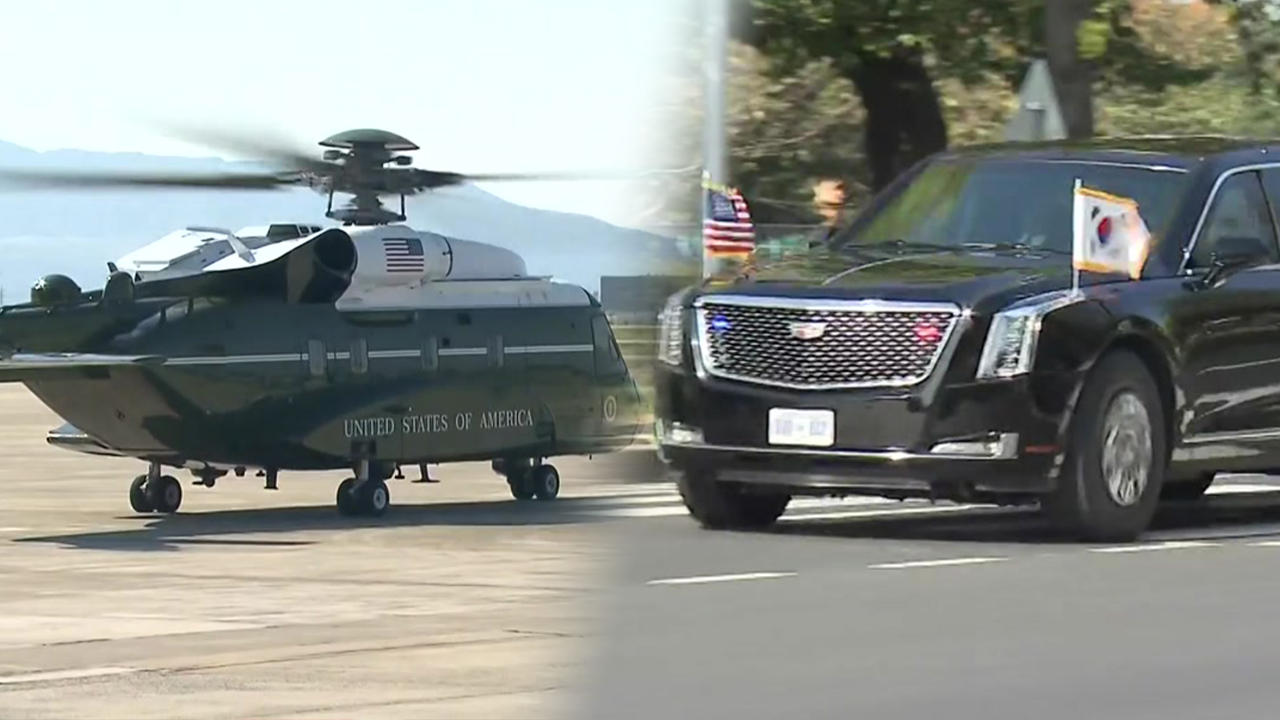 8년 만에 국빈 방한한 트럼프 대통령은 이번에도 전용기 에어포스원으로 부산에 도착해 전용헬기 '마린 원'으로 경주로 이동했고 행사 장소에는 전용차량인 '비스트'를 타고 나타났습니다.