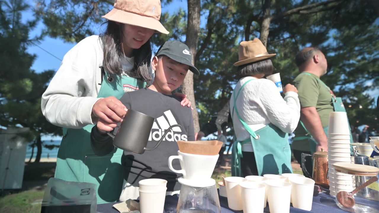 해송 숲을 따라 길게 줄지어 선 바리스타 100명이 한꺼번에 커피를 내립니다.