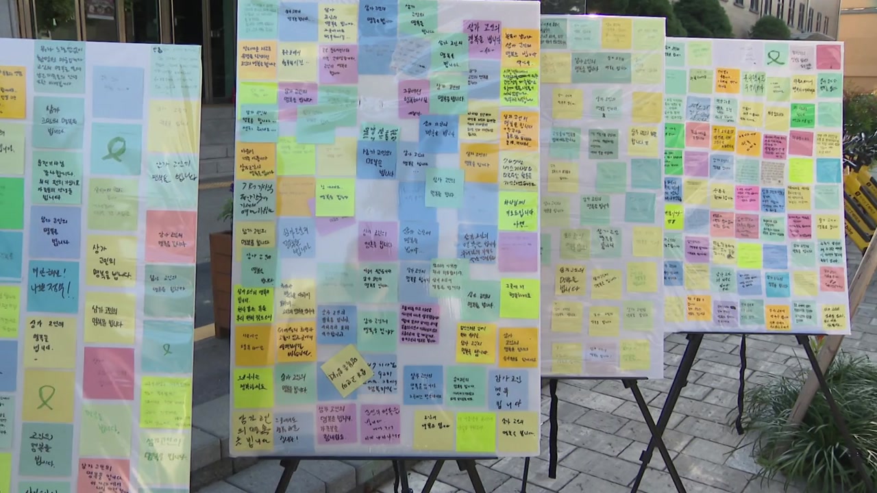 게시판에 오송 참사 희생자들을 추모하는 문구가 빼곡히 붙어 있습니다.