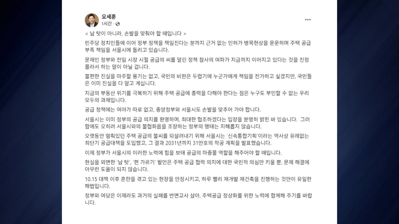 오 시장은 "정부와 여당은 이제라도 과거의 실패를 반면교사 삼아 주택공급 정상화를 위한 노력에 함께해주기를 바란다"고 당부했습니다.