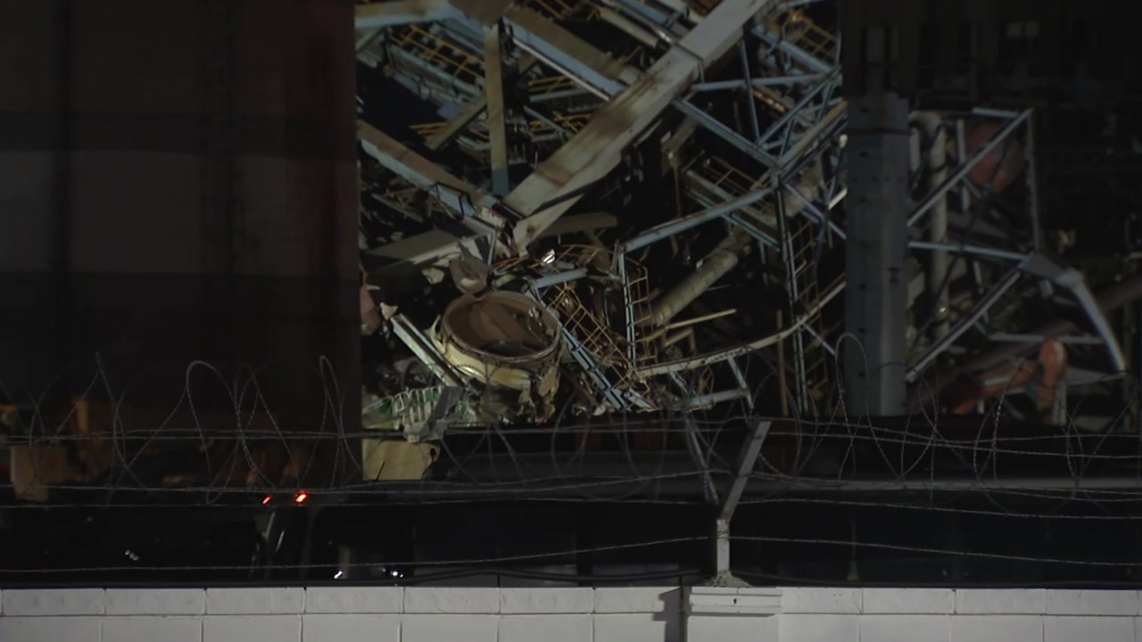 무너진 시설물은 가동이 중단된 높이 60m 정도의 보일러 타워입니다.
