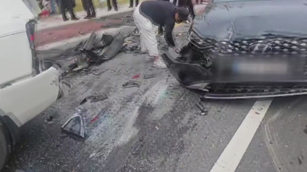 사고 충격으로 오토바이가 튕겨 나가 택시 등 신호대기 중이던 차량 7대가 연쇄 추돌했습니다.