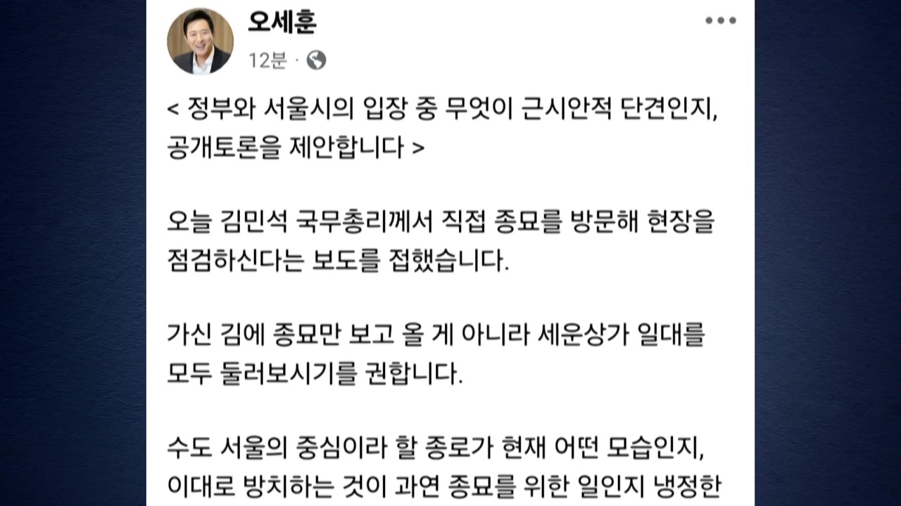 유네스코 세계유산인 종묘 앞 세운4구역 재개발 논란이 이어지자, 오세훈 서울시장이 김민석 국무총리에게 공개 토론을 제안했습니다.