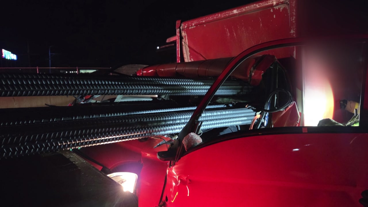 어젯밤(10일) 10시쯤 경부고속도로 부산 방향 천안호두휴게소 인근에서 1톤 화물차가 철근을 싣고 가던 25톤 화물차를 들이받았습니다.